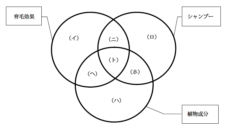 下のベン図は「植物成分が配合されており、育毛効果のあるシャンプー」を求める検索における集合関係を示している。次の「 」内の文章に示した文献が最も高い精度で含まれる集合を選べ。「サクラ葉抽出液を配合した育毛効果のない白髪染めに関する文献。」